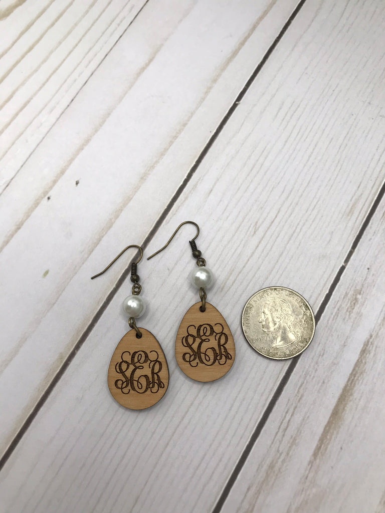 Our pearl monogram wood earrings are precisely laser cut and engraved.
