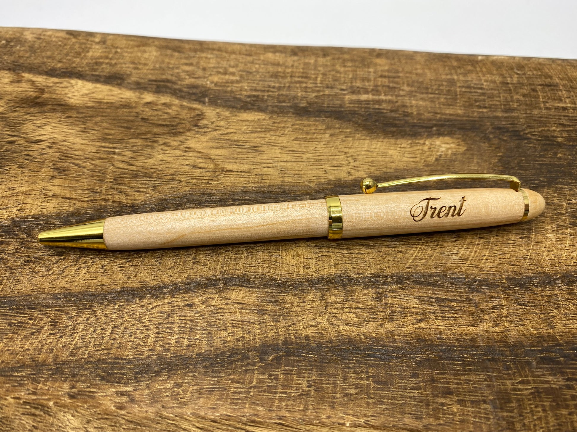 Lovely solid maple writing pen or mechanical pencil. Engraved with the custom text of your choice (size constraint based on pen size; maximum 2 line height).
