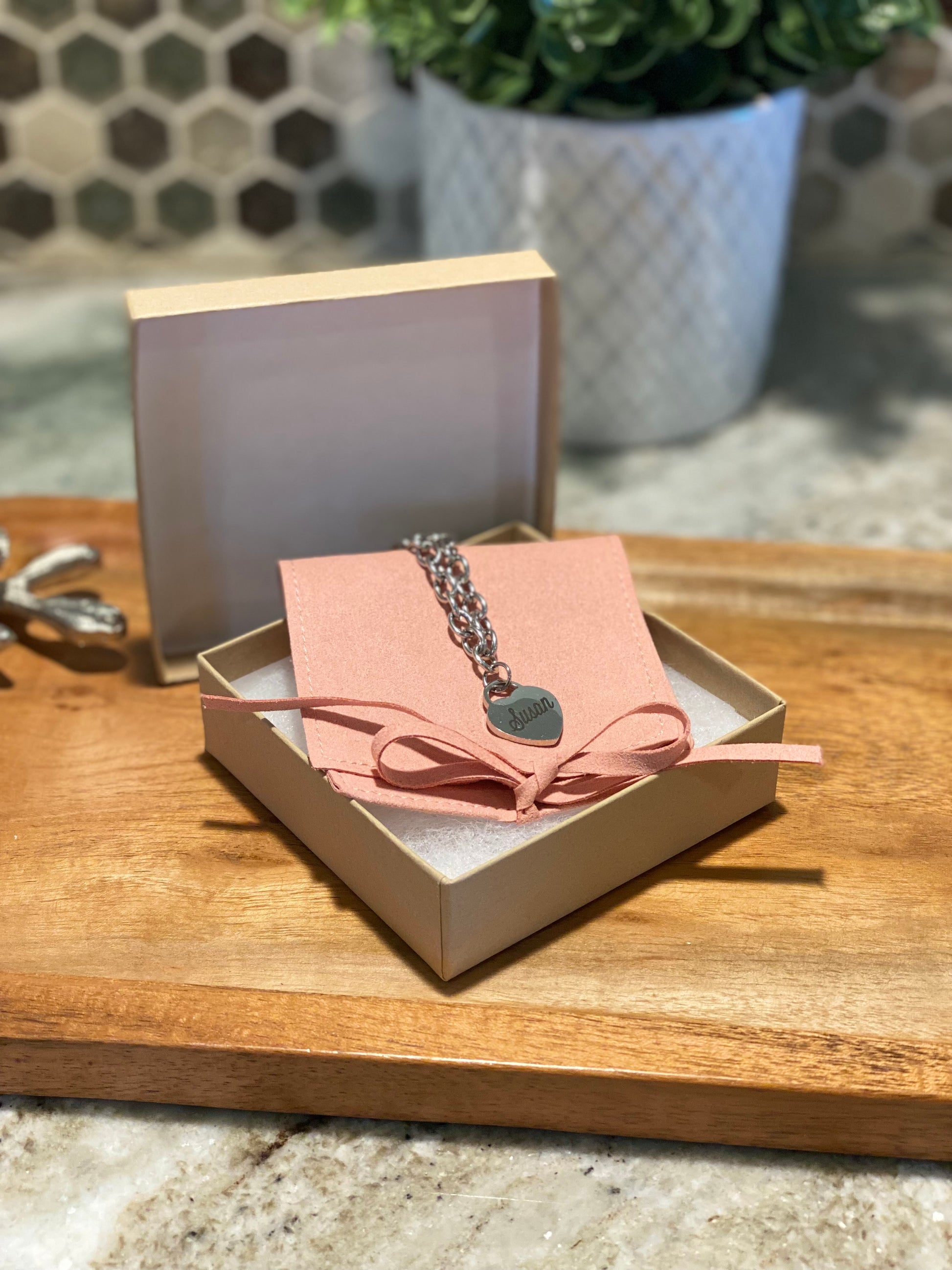 A thoughtful gift for that special someone in your life, our heart charm bracelet is personalized with the name of your choice and comes ready for gifting in the perfect microfiber bow tie pouch. Heart charm personalization is included!