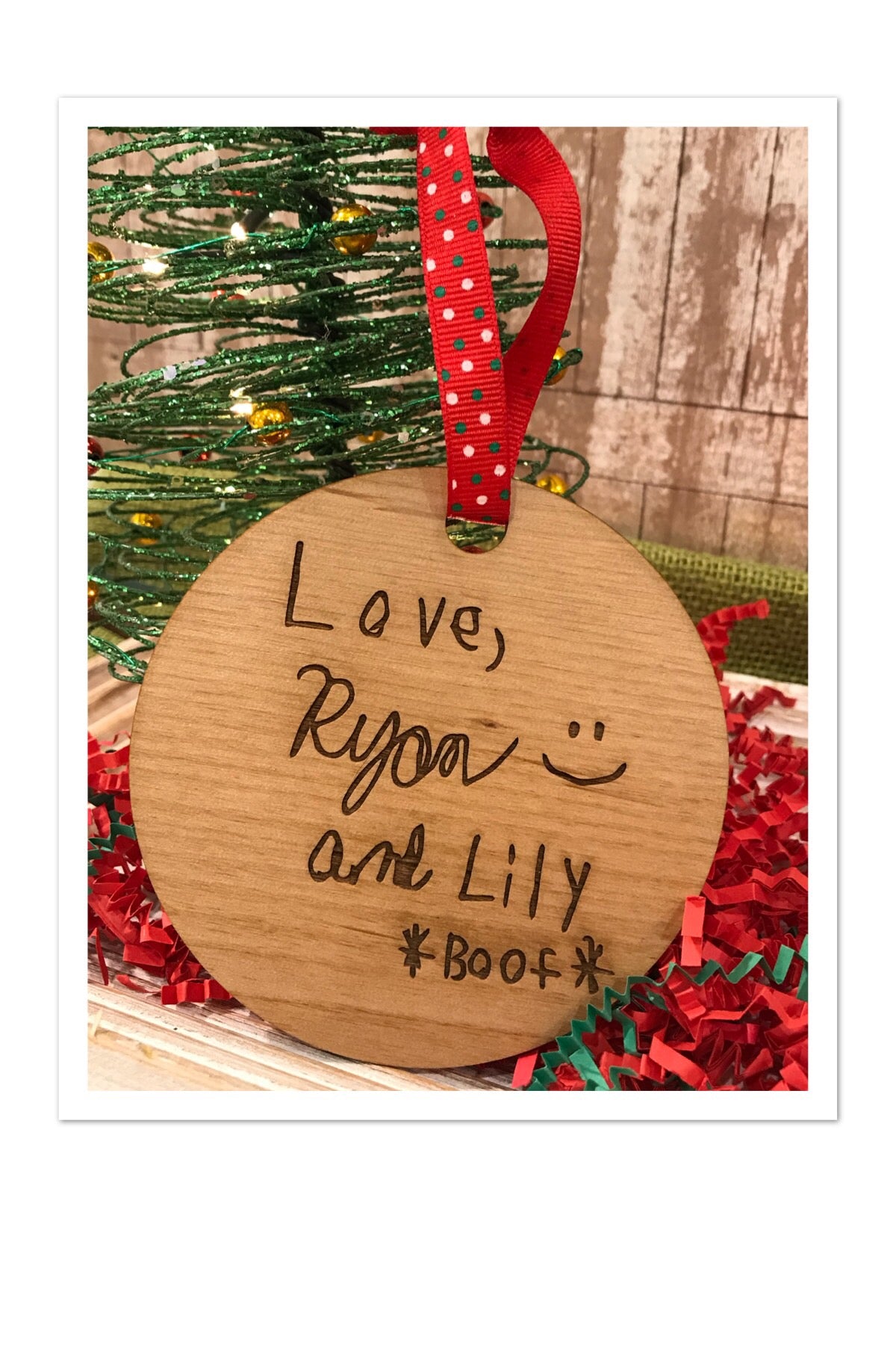 Do you have saved greeting cards, letters or documents with your loved one's handwriting? Make it personal with this laser engraved custom ornament complete with the handwriting of you or your special loved one.